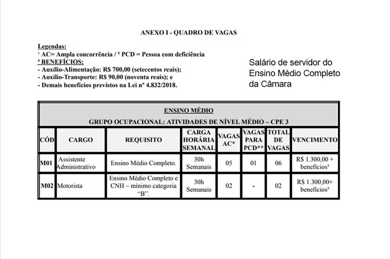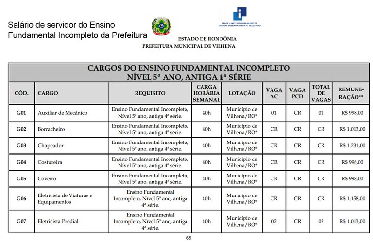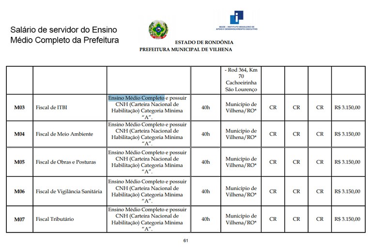 O salário base de um servidor de nível fundamental da Prefeitura de Vilhena é semelhante ao de um nível médio da Câmara de Vereadores, e o salário base de um nível médio da Prefeitura de Vilhena chega a ser quase o dobro de um servidor do mesmo nível da Câmara de Vereadores. O salário-base vai para a aposentadoria, e o auxílio alimentação, não.