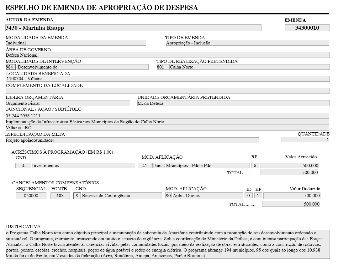 A vereadora Vera da Farmácia (MDB) fez um pedido para ex-deputada federal Marinha Raupp (MDB) no ano passado, para que destinasse uma verba de R$ 500 mil para Vilhena, através do programa Calha Norte, do Ministério da Defesa, que visa desenvolver a infraestrutura das cidades da Amazônia.